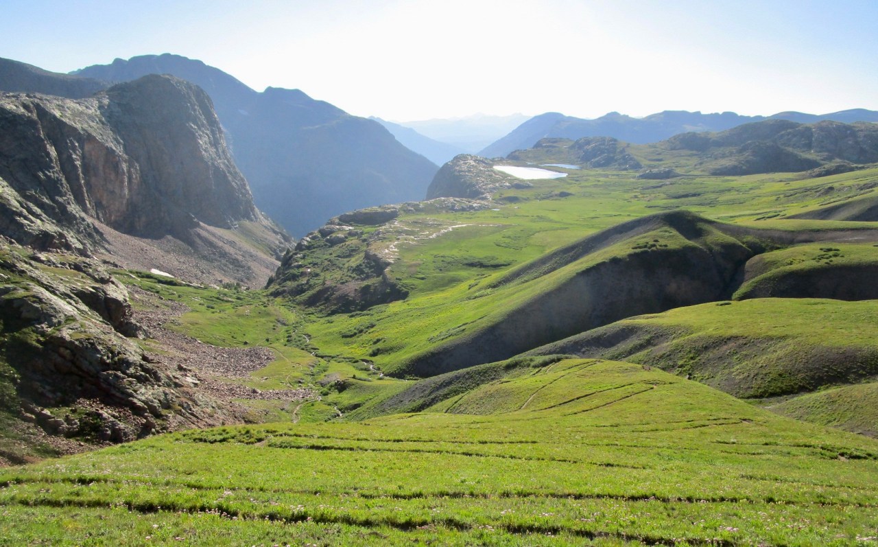 The views were awe-inspiring. In every direction, mountains were silhouetted against more mountains in dramatic folds. Their graceful slopes would intermittently give way to sheer, brightly colored cliffs. The cliff faces were stratified with blue, orange, and pink bedrock, inadvertently displaying eons of geologic formation and erosion. The trail wound through valleys, modest peaks, and massive plateaus that were dimpled with lakes. Their smooth, mirror-like surfaces dappled with rocks and were disturbed only by the wind sweeping across the terrain.